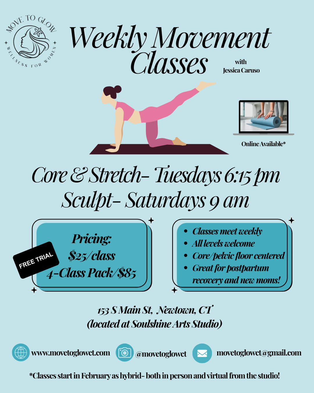 To register online, fill out the waiver form ( a one-time requirement) and then purchase the class. You can also email movetoglowct@gmail.com to register and pay using other payment options.